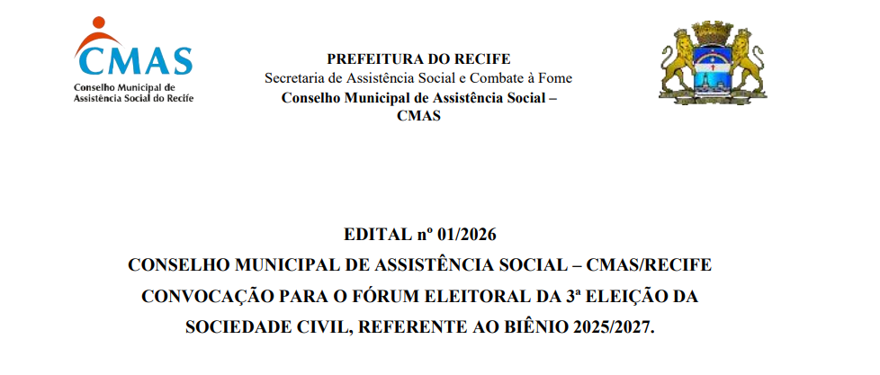 O Conselho Municipal de Assistência Social (CMAS) informa a publicação da Resolução nº 04/2026 no Diário Oficial do Recife (Edição nº 010, de 27/01/2026), que aprova o Edital e o Regimento Eleitoral da 3ª Eleição da Sociedade Civil, referente ao Biênio 2025/2027.